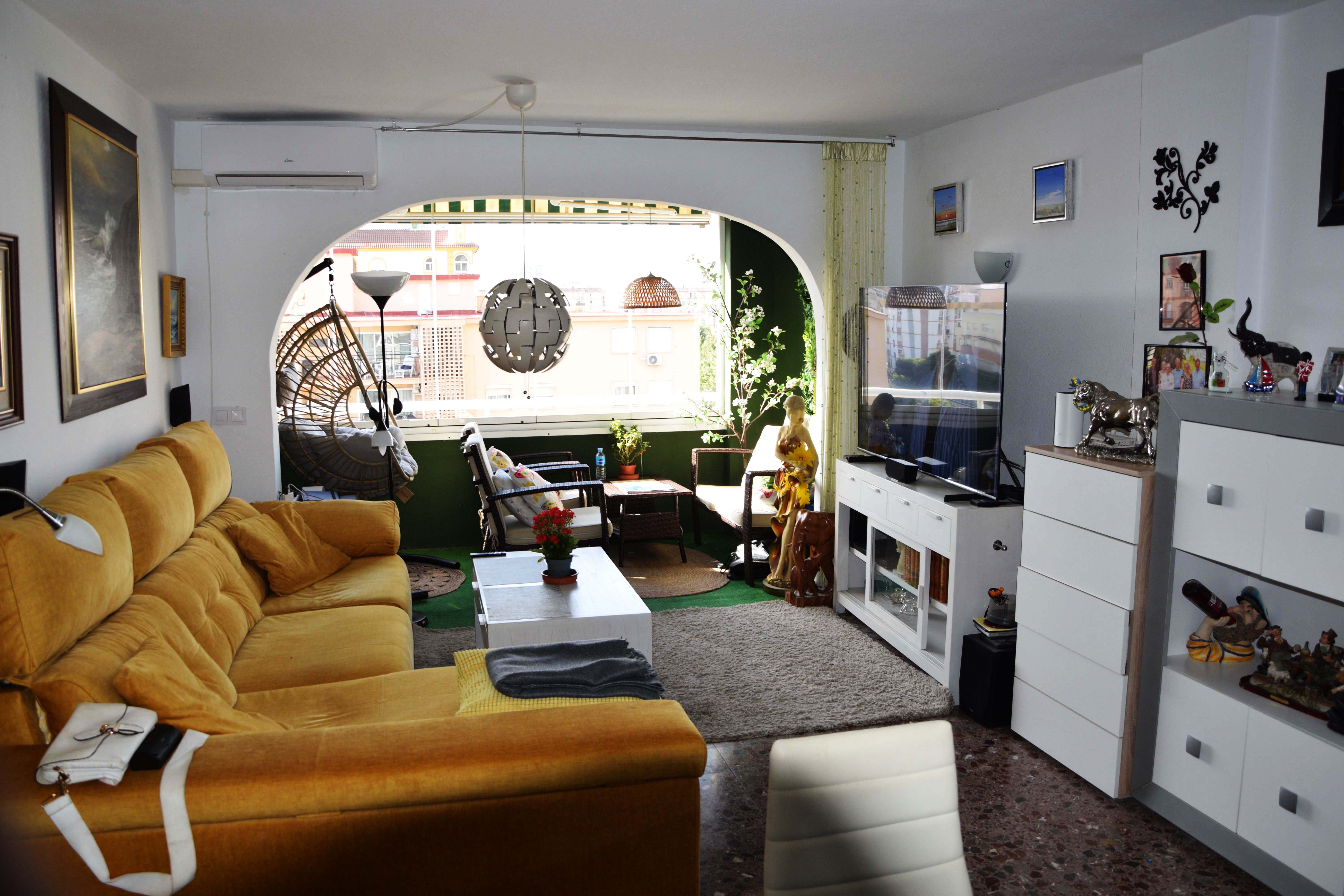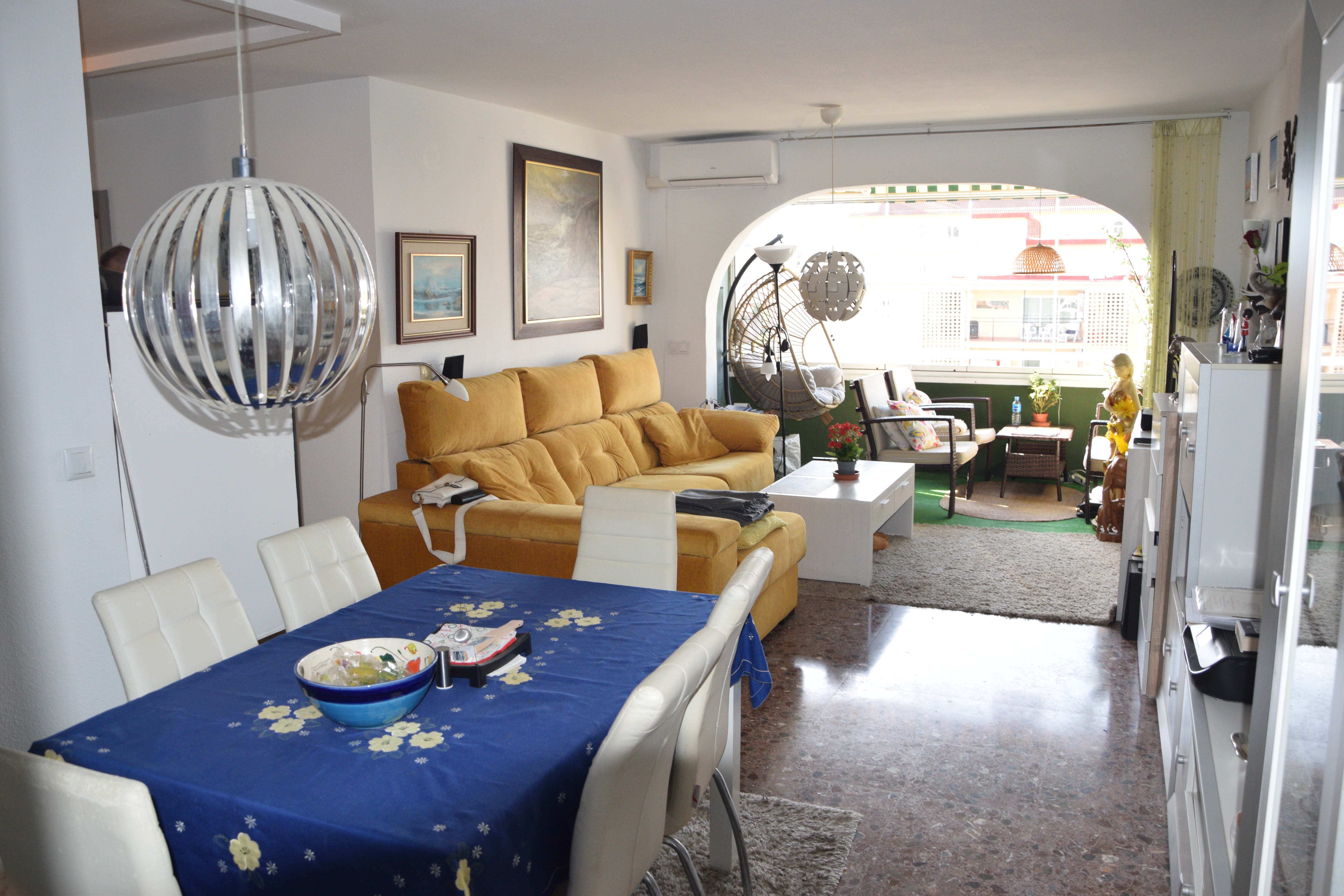 A bright and spacious apartment situated in the centre of Los Boliches and only 5 minutes walk from the beach, accommodation comprises three bedrooms, two bathrooms, large lounge- dining room, sunny west facing terrace fitted with quality 'glass curtains' (sea views from some points of the property), fully refurbished open plan kitchen with separate utility area, A/C hot+cold, communal storage area on ground floor for bicycles and mobility scooters, two swimming pools with communal gardens and tennis court, centrally located close to all amenities, supermarkets, schools, train station etc. , viewing is highly recommended.